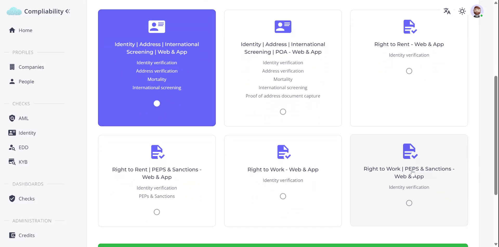 A range of identity verification options will be presented. Select the option for identity verification that includes address verification, mortality check, and international screening.