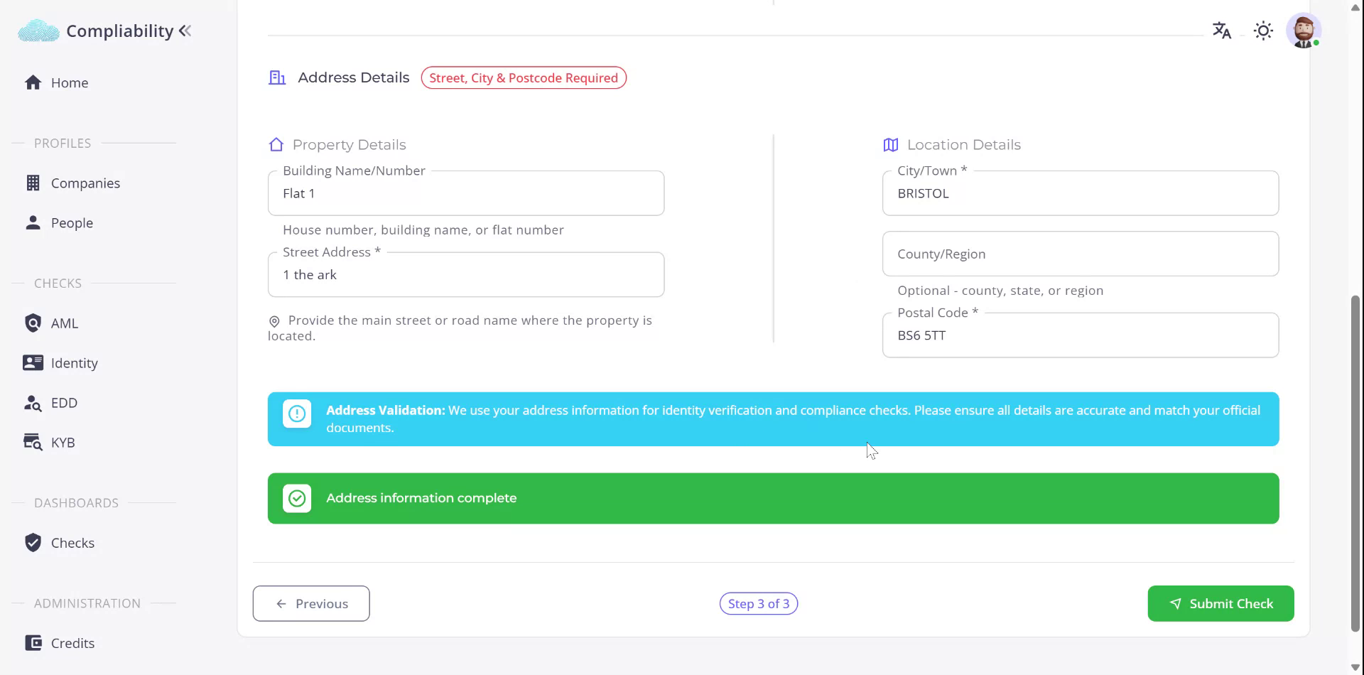 Edit the address details as required. Once all information is confirmed and complete, you are ready to submit the identity check.