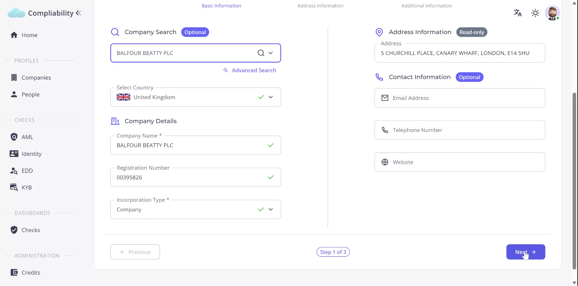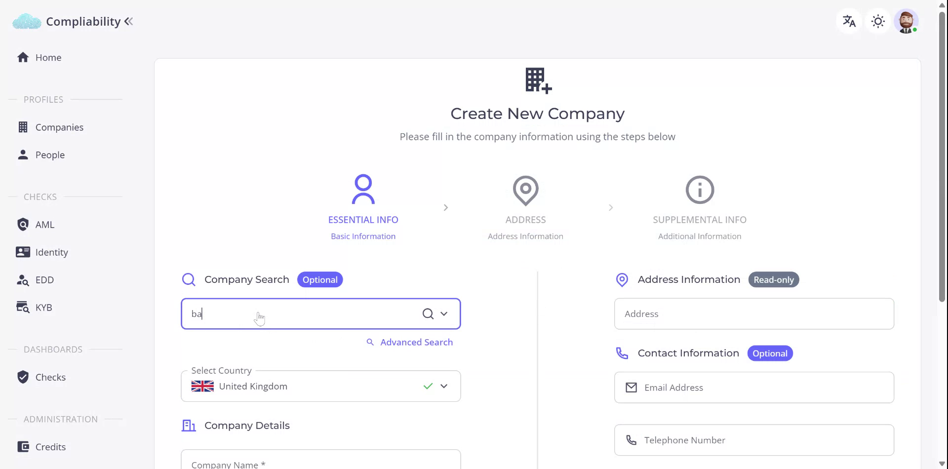 Begin by creating a new company profile by selecting the Company Journey. You can search for the company of interest or enter the known information directly.