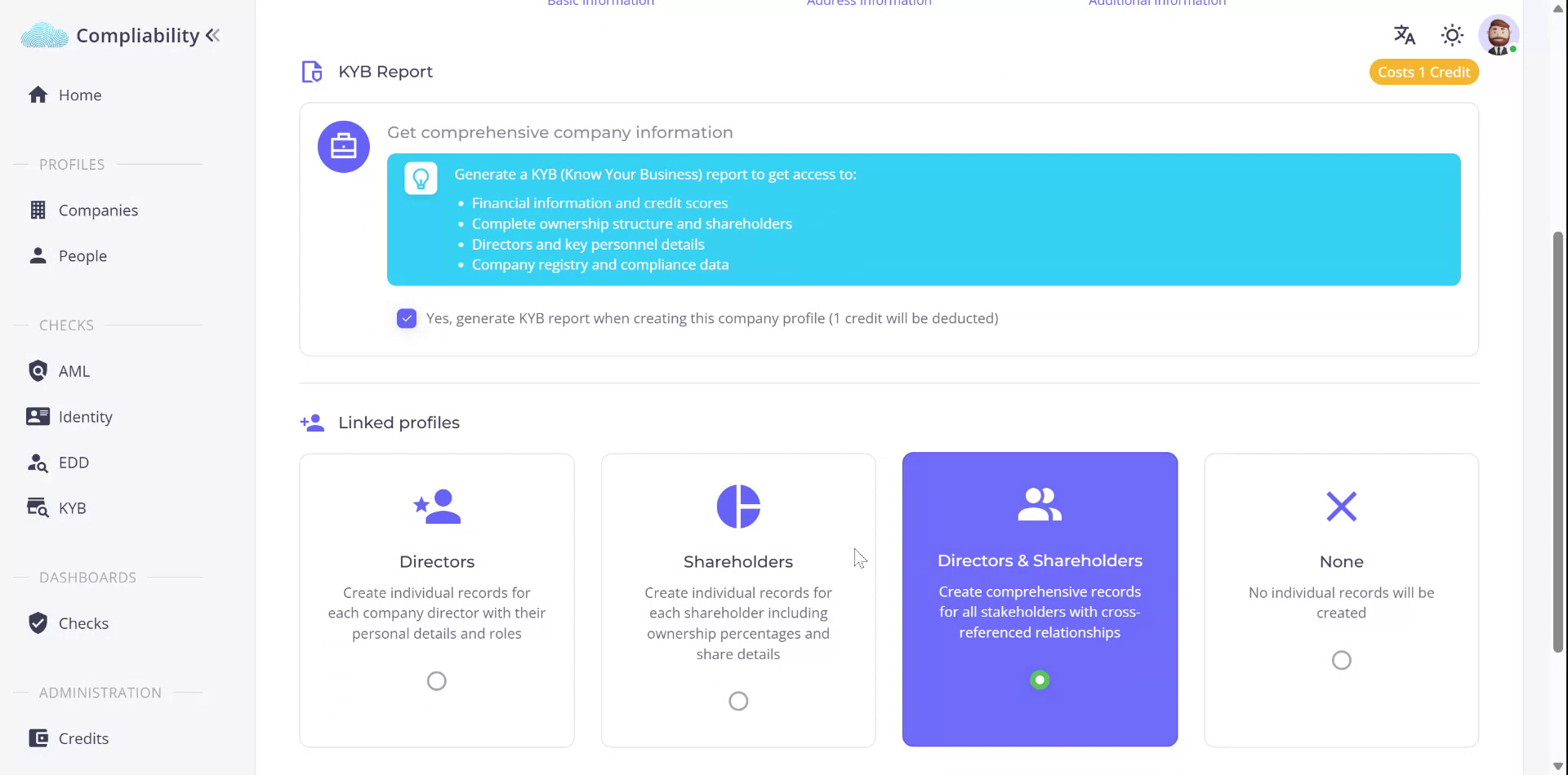 At this stage, prepare to finalize the company creation. Use the KYB report feature to obtain additional information about the company, enhancing the profile. Options include adding company directors, shareholders, or both, or opting to create a basic company profile.
