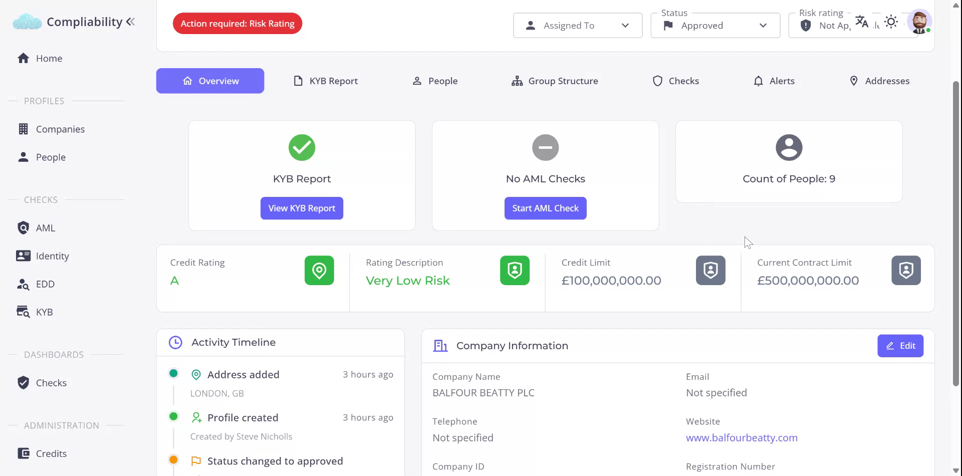Examine the risk profile, which includes credit rating, credit limits, and basic company information. In this instance, the full Know Your Business (KYB) report has been completed, providing extensive information about the company’s risk profile, basic details, and comprehensive financial statements over a five-year period, including balance sheets and profit and loss statements.