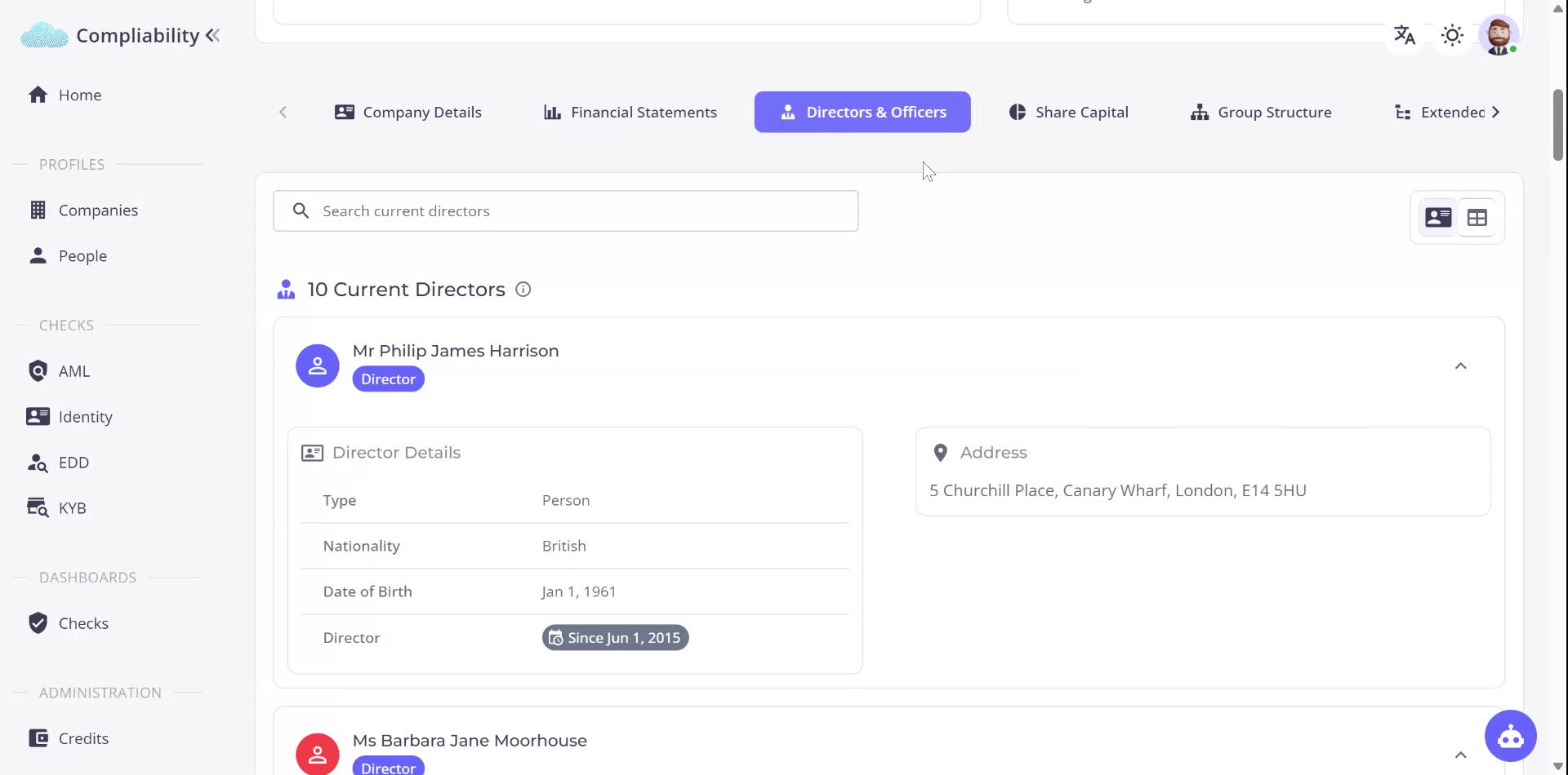 Understand that the KYB report is highly detailed. Proceed to the People tab to access comprehensive information about individuals associated with the company, including directors and shareholders. You can explore these profiles further and conduct additional checks from this report.