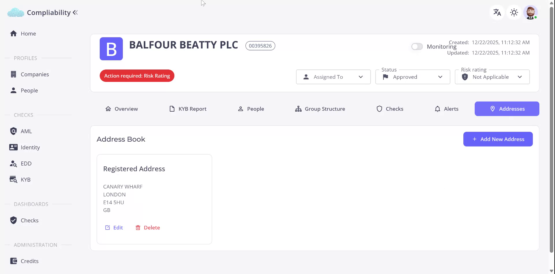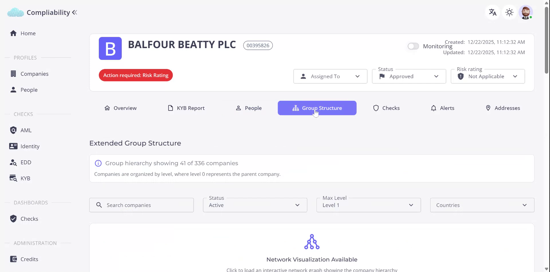 Revisit the group structure and any checks conducted against this company, including AML checks and alerts like adverse media. Also, review further addressing information. This concludes the company report analysis process.
