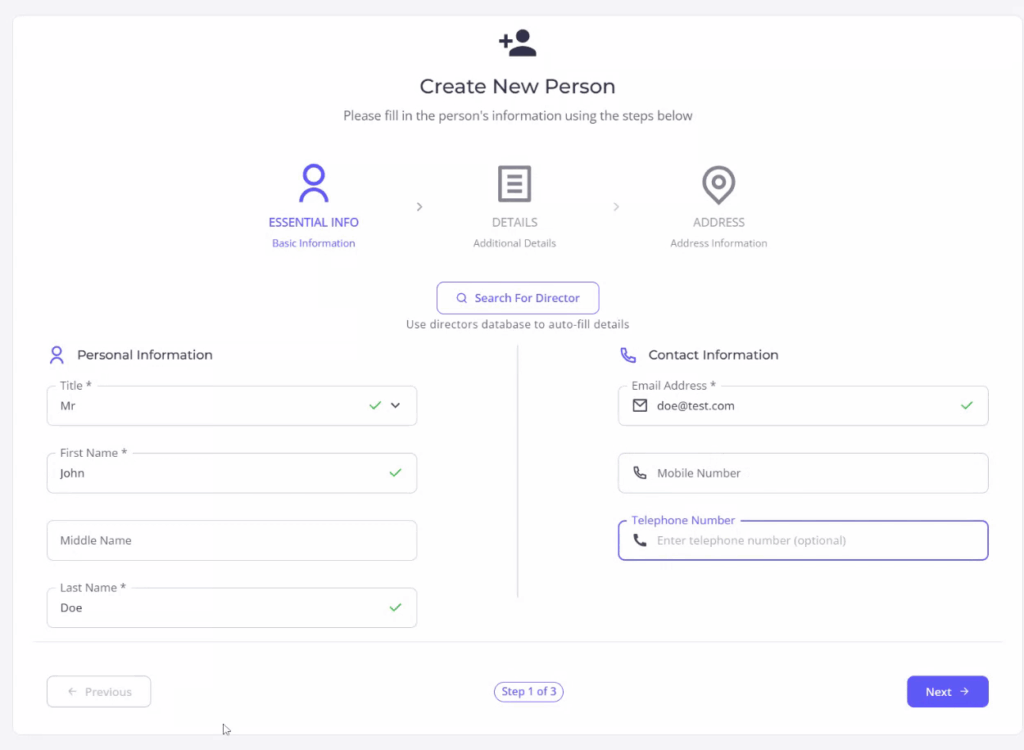 Begin by creating an individual’s profile. You have the option to use the director’s database to autofill details or input them manually.