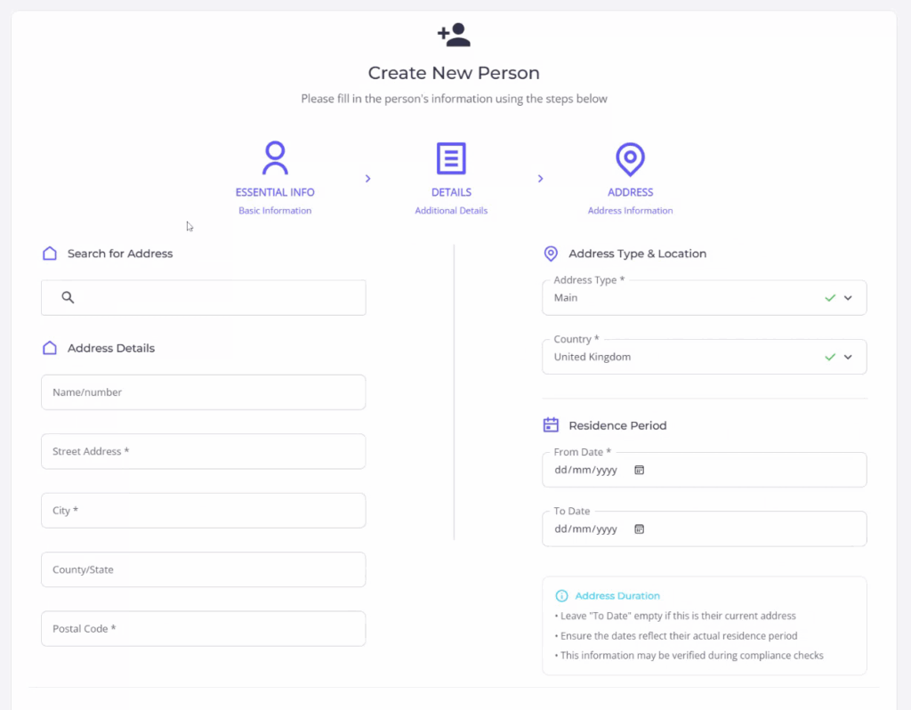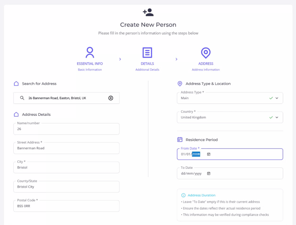 Utilize the search function to find and enter the individual’s address. Ensure to also enter the start date of residence.