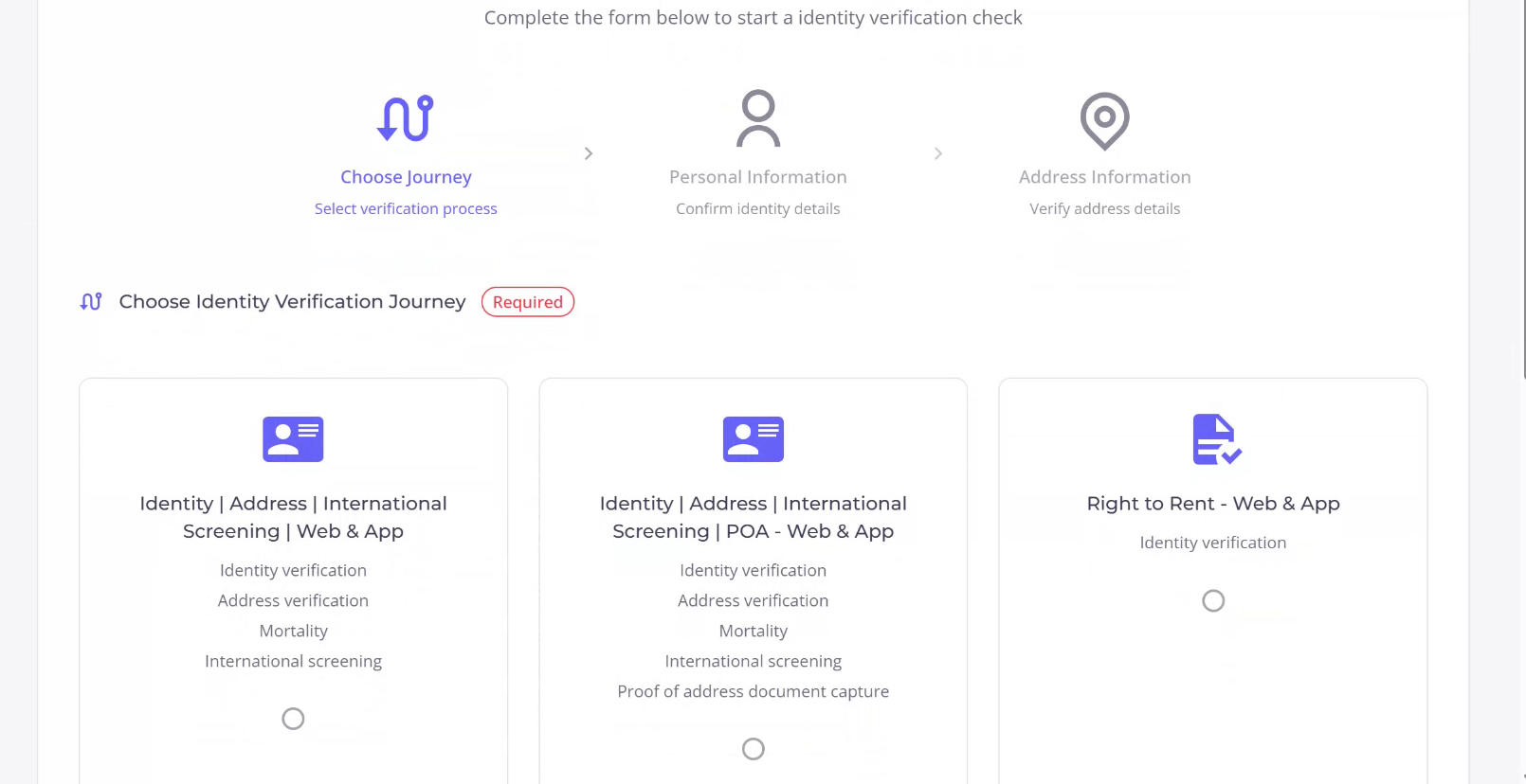 Access the individual’s profile. Here, you will have the option to initiate an IDV check. Click on this option to be presented with various identity verification journeys available.